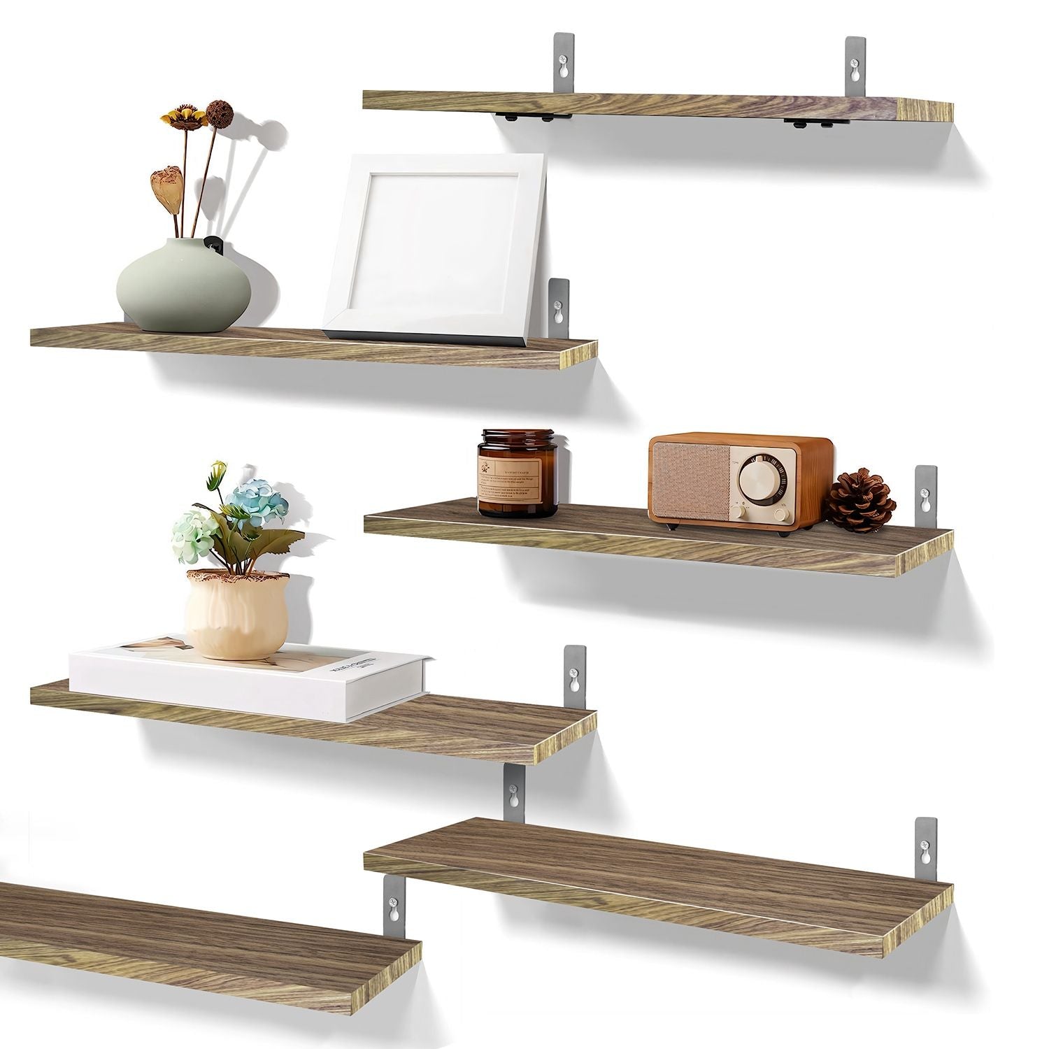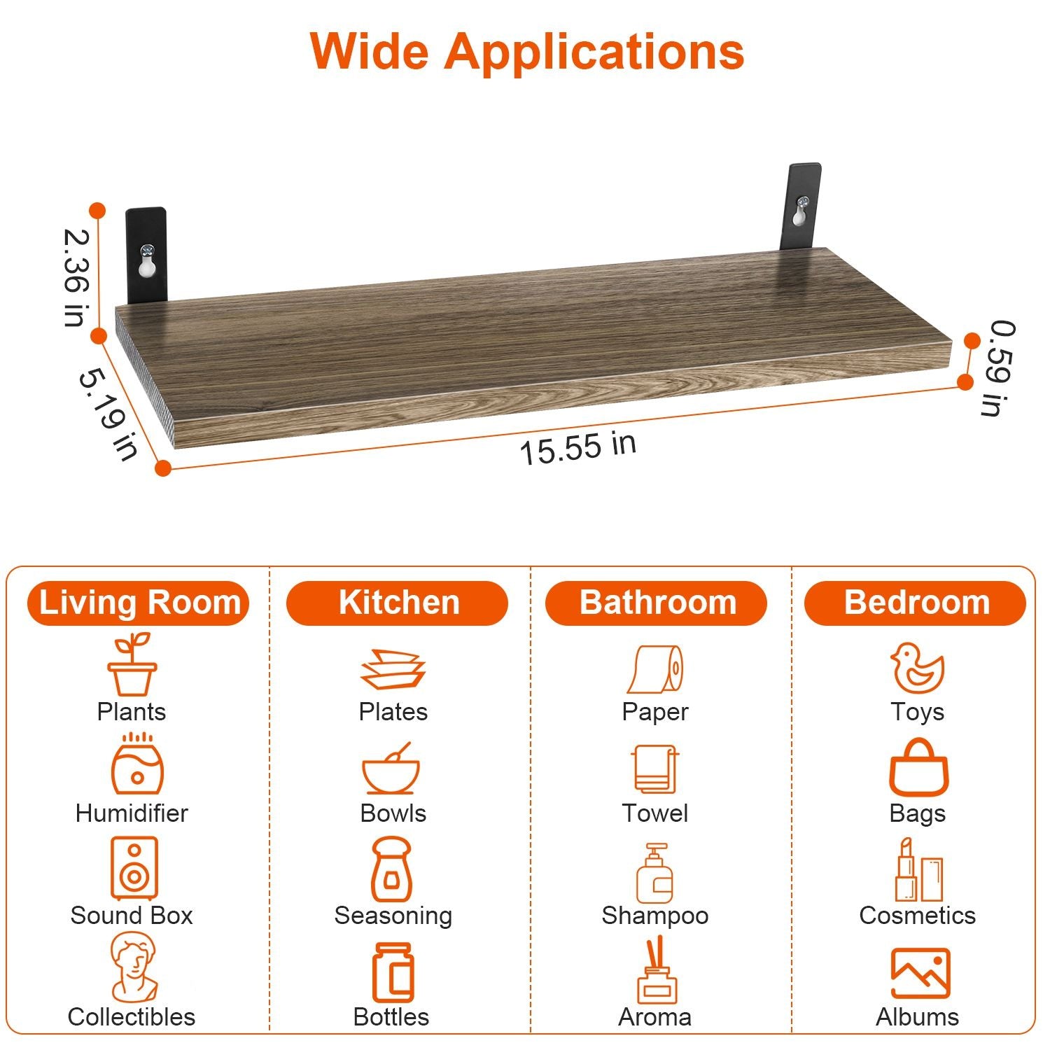 6 Sets Floating Shelves 15.55x5.19Inch Wall Mounted Shelves Wood Storage Shelves Metal Bracket Hanging Display Shelf Wall Organizer for Living Room Bathroom Kitchen Decor