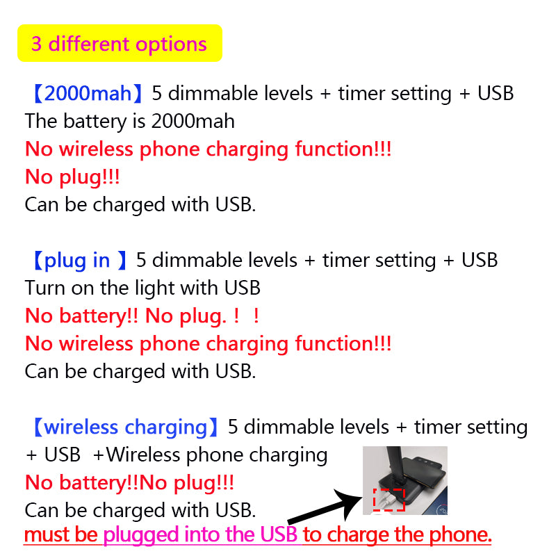 Introducing the Led USB Desk Lamp, the perfect solution for your lighting needs. This lamp features 5 dimmable levels, a timer setting, and a USB charging port, making it super convenient and easy to use. The 2000mAh battery gives you plenty of power to keep the light going, and the wireless phone charging function means you can always stay connected. Best of all, the sleek and modern design is sure to complement any space. So don't wait any longer, get the Led USB Desk Lamp today!