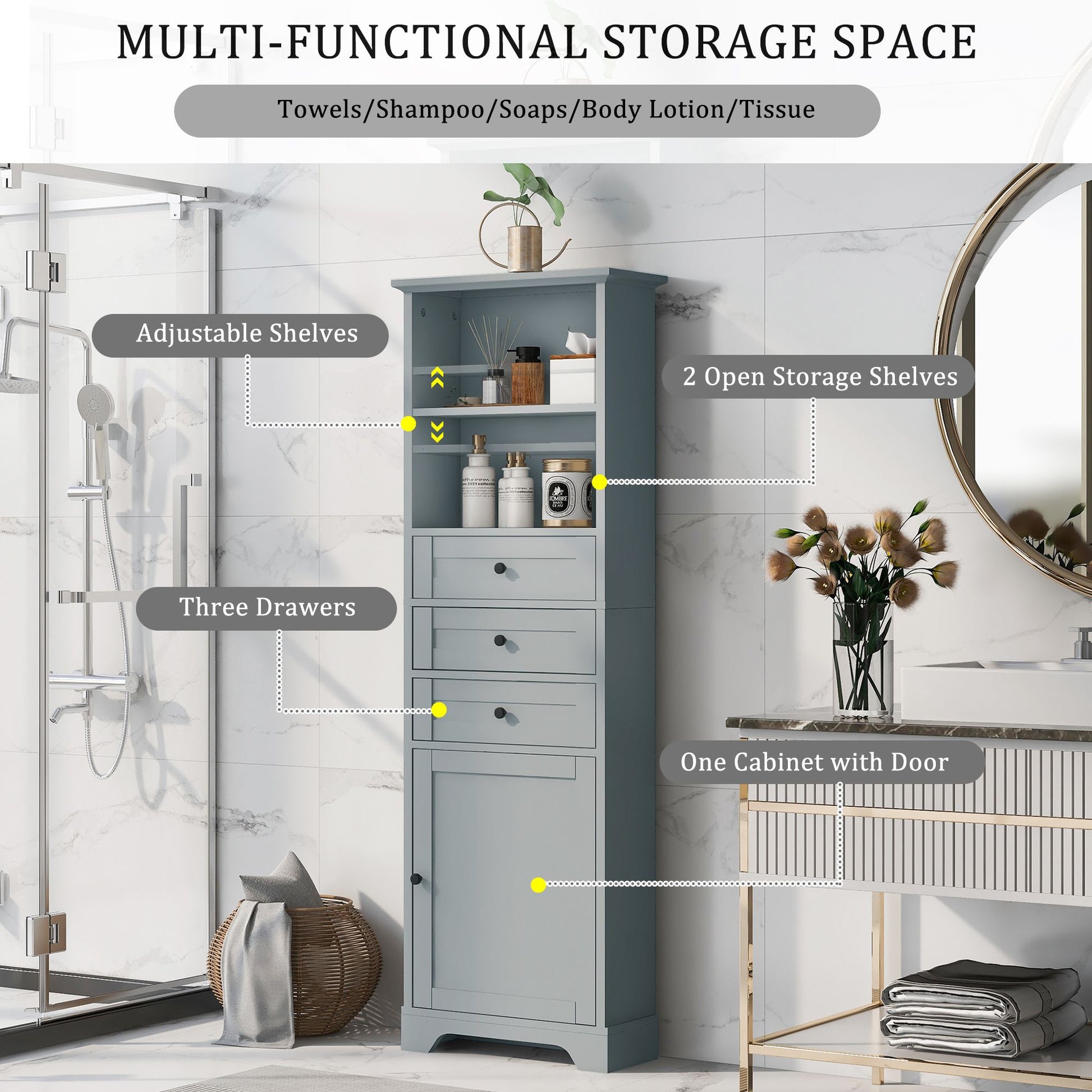Adjustable Shelves :The shelf of this cabinet can be adjusted into three different heights and to hold items in different size. You can put shampoo, towel, body lotion, tissues and storage basket etc., which totally satisfies customers' different needs.