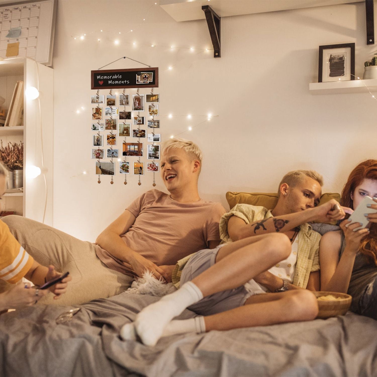 Wooden Hanging Picture Frame Photo Display String Ropes with 30 Clips Writable Blackboard Wall Decoration Postcard Artwork Picture Organizer
